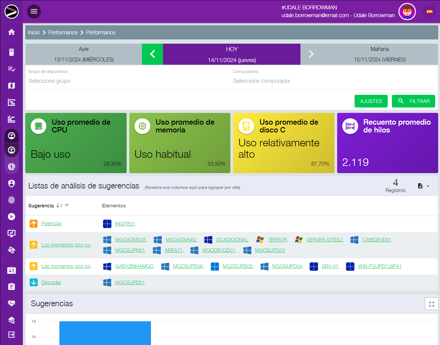 El sistema indica si el equipo supera o no satisface las necesidades del empleado, sugiriendo cambios que van desde añadir más memoria y sustituir el disco duro por una unidad SSD, hasta reasignar los dispositivos infrautilizados a otro empleado.