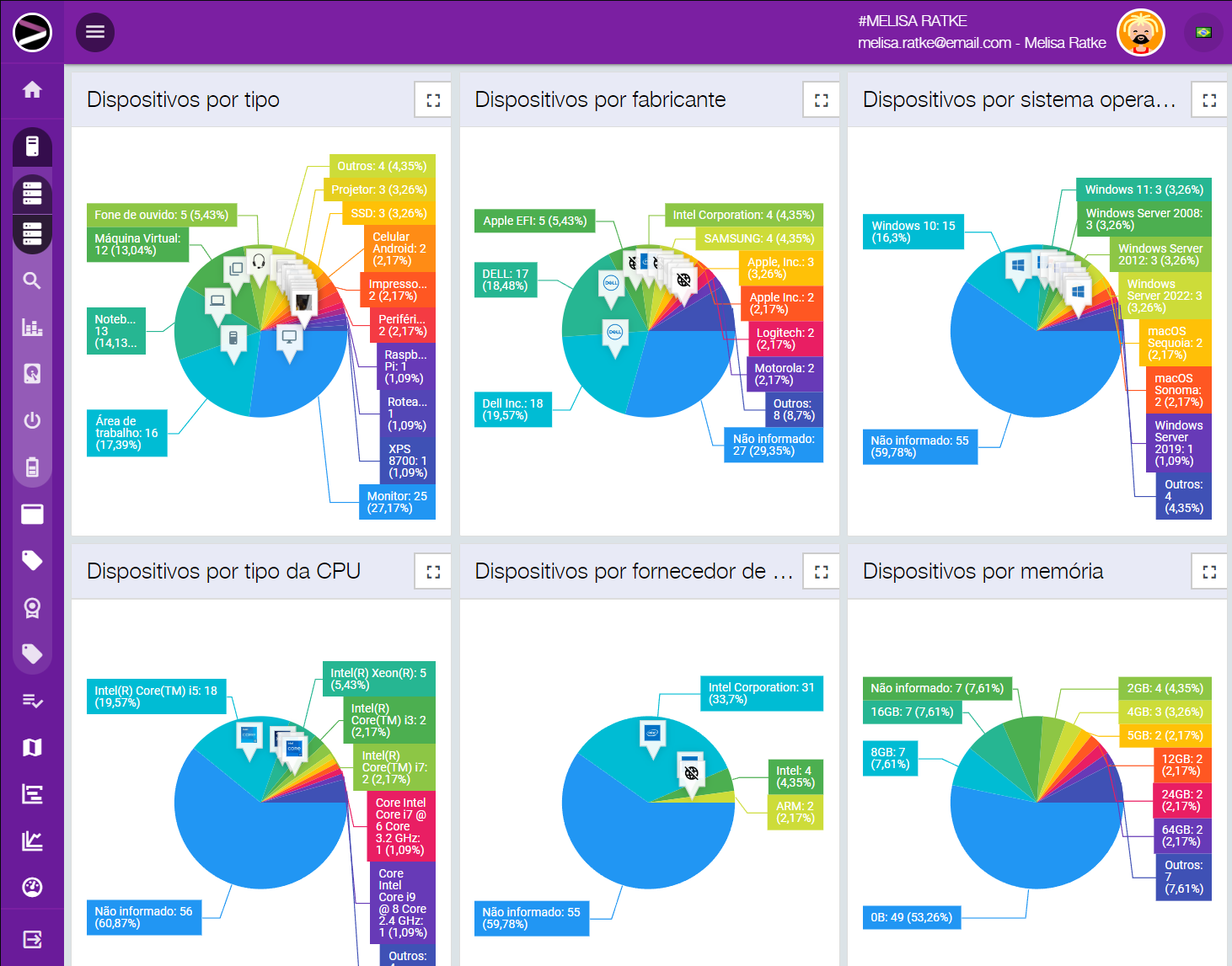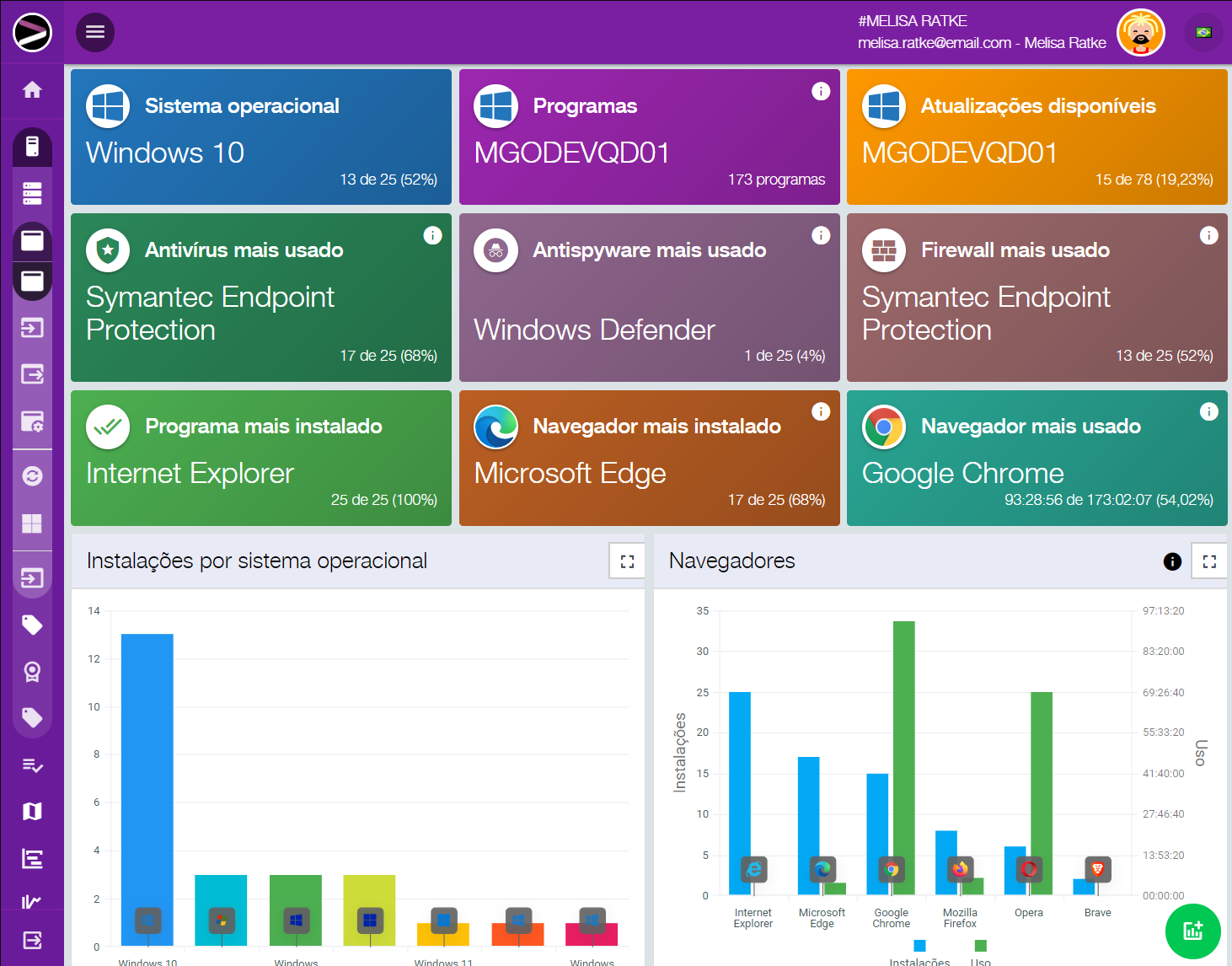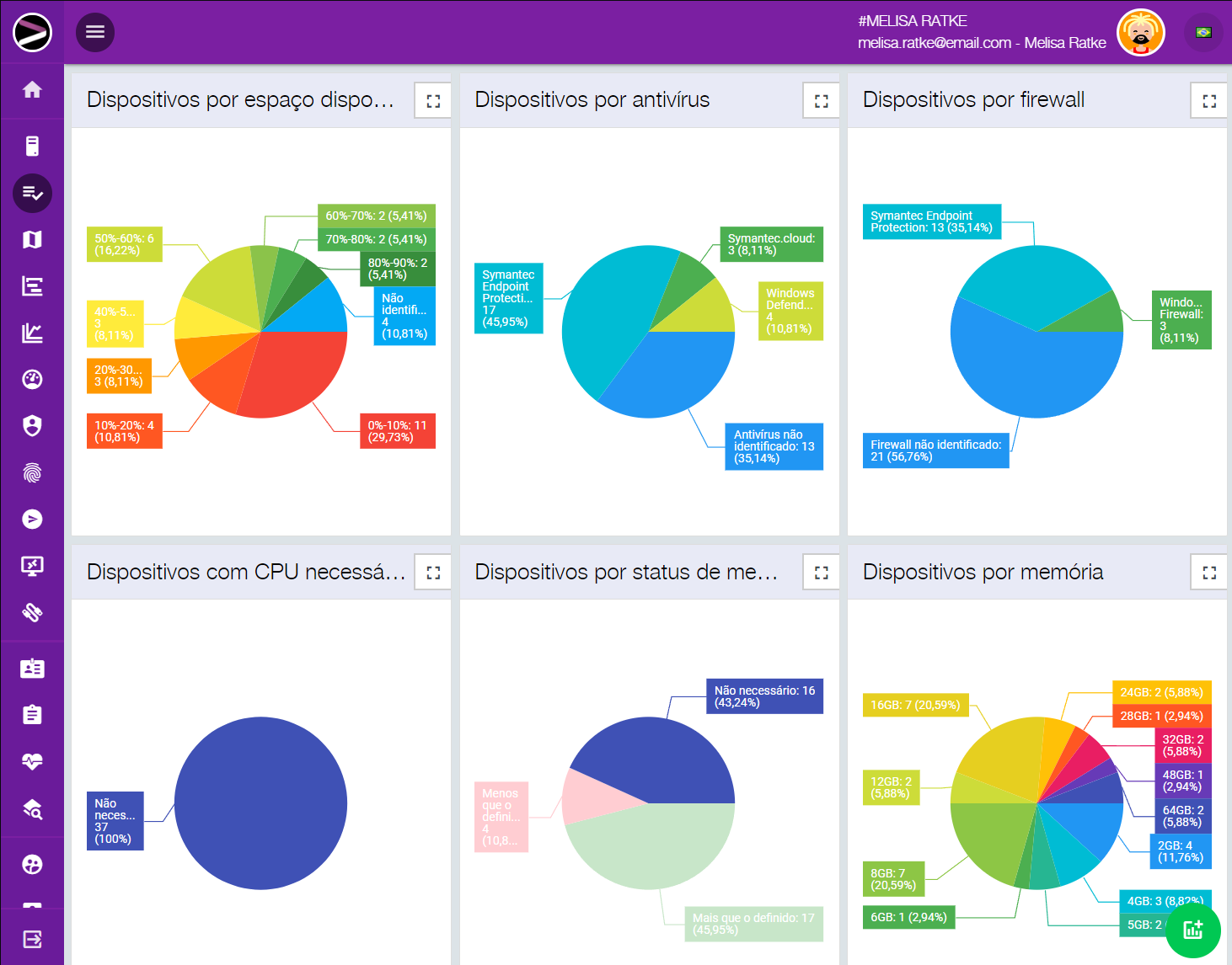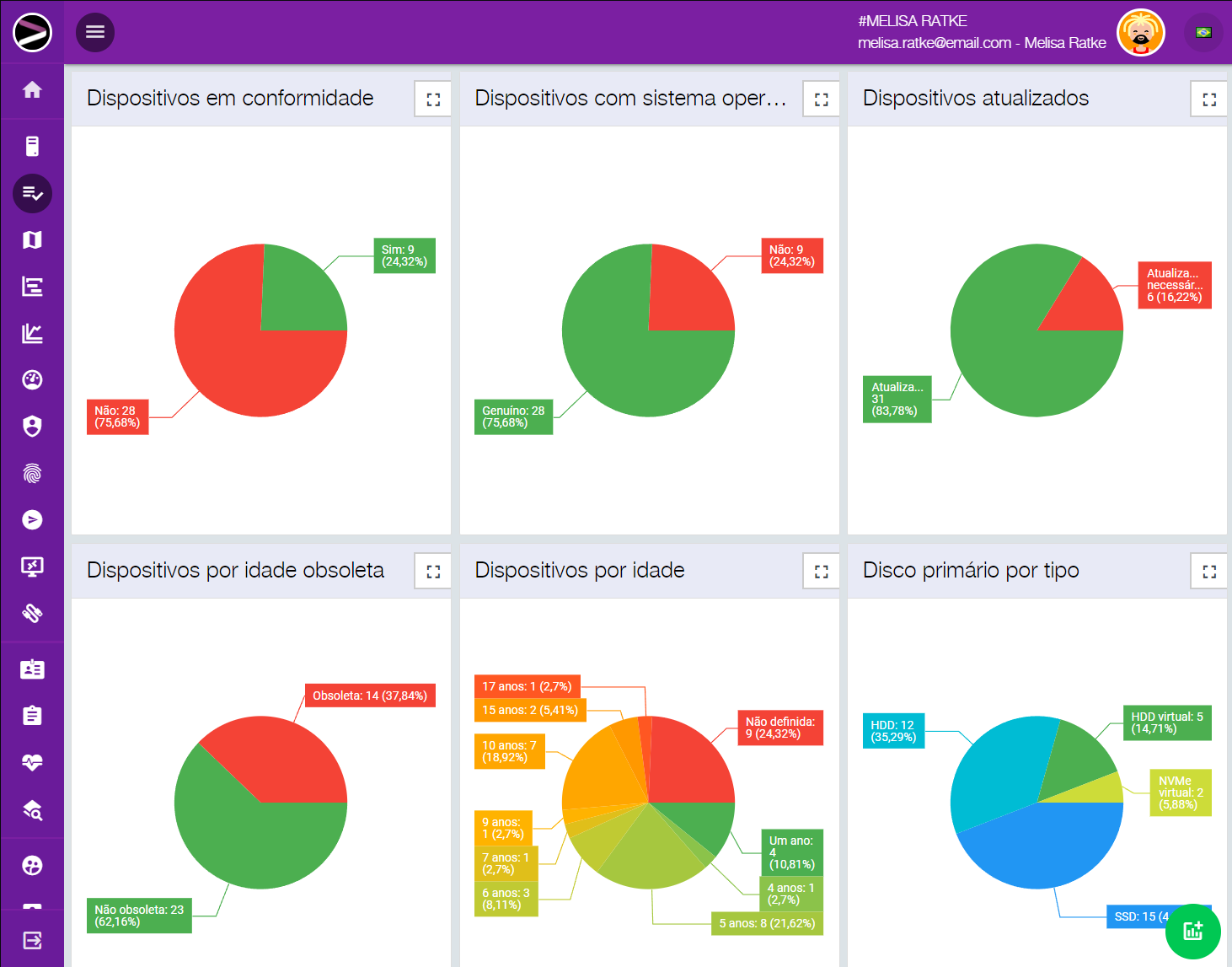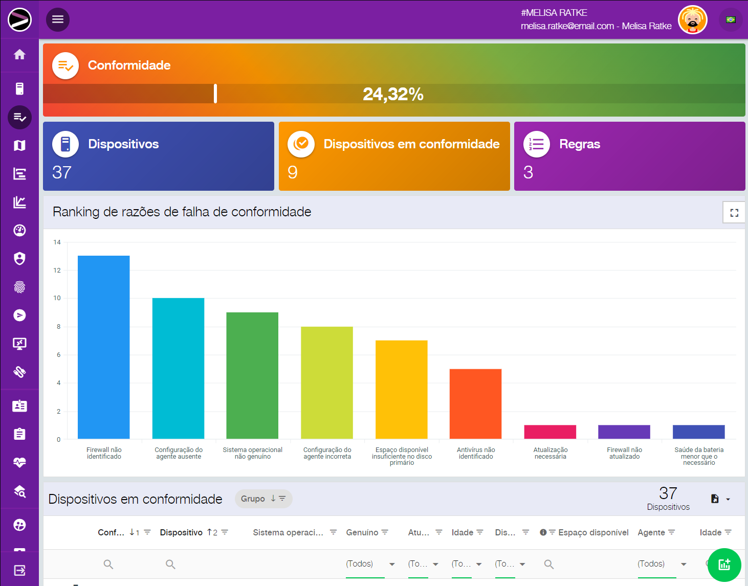 Um recurso que vale destacar é o compliance. Nele você cria as regras de como a sua rede deve se comportar para estar em compliance, como versões de Windows homologadas com seus hardwares compatíveis, licenças genuínas, nível de obsolescência, se deve ou não ter antivírus instalado e atualizado, firewall, Windows atualizado sem vulnerabilidades críticas, entre inúmeras outras características. Uma vez definido, você deixa nossa inteligência artificial cuidar da sua rede e lhe enviar resumos com sugestões do que deve ser alterado ou manualmente verificado.