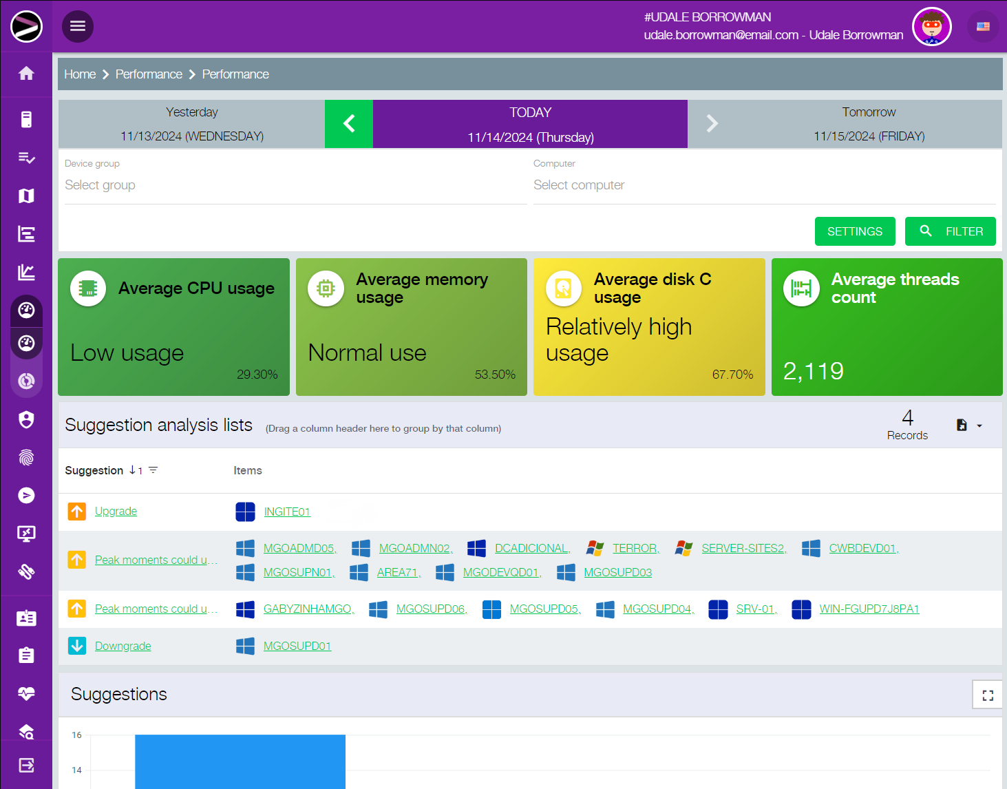 The system indicates whether the machine is exceeding or falling short of the employee's needs, suggesting changes ranging from adding more memory and replacing the HDD with an SSD, to reassigning underutilized devices to another employee.